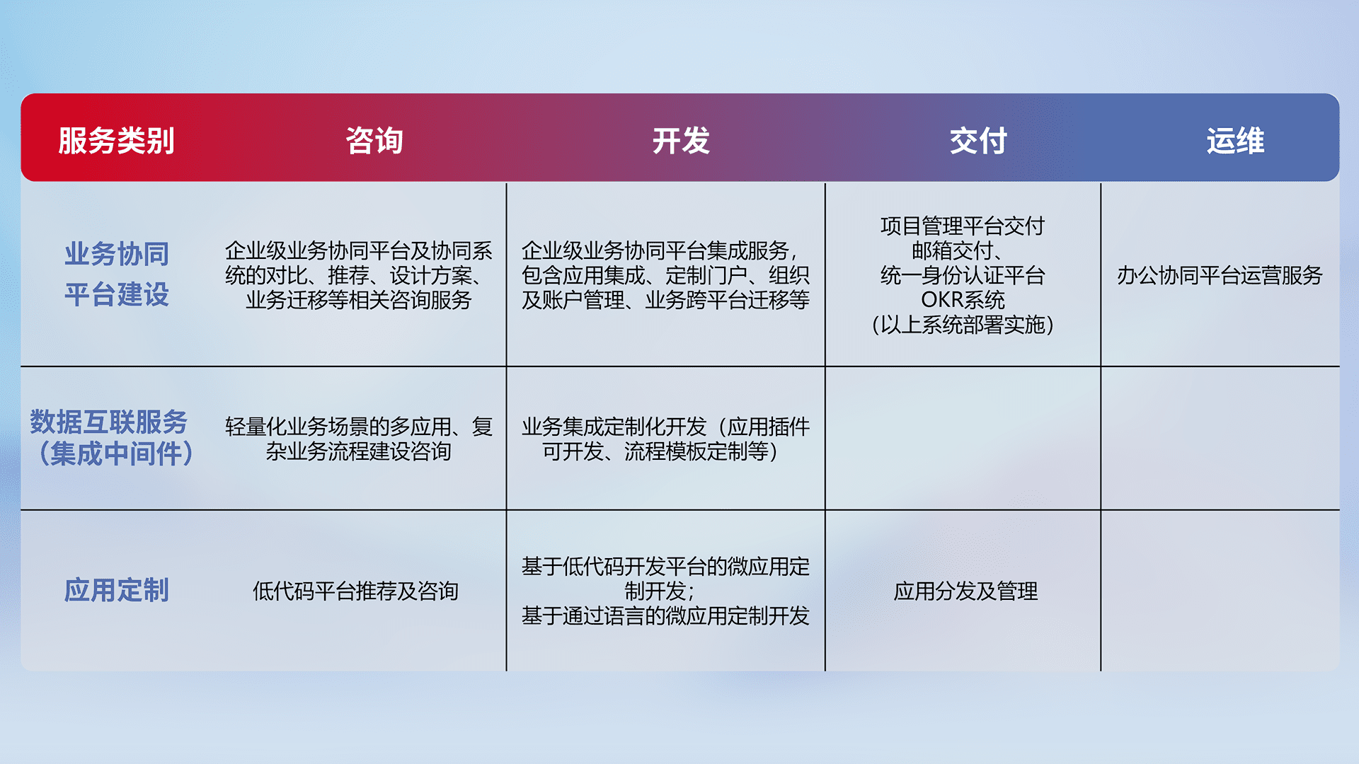 针对钉钉、、、、企微、、、、IDaas等平台级产品提供产品的规划、、方案、、、交付、、定制化开发等服务,,,实现如统一协同办公、、、智能客户服务、、混合会议管理、、智能数据查询、、、等业务场景,,实现数字化转型。。。
